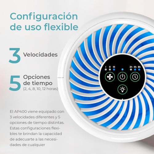 ⭐​ User-friendly display panel: With 3 different speeds and 5 different time settings, the AP400 offers complete flexibility to adjust purification based on the room and situation.