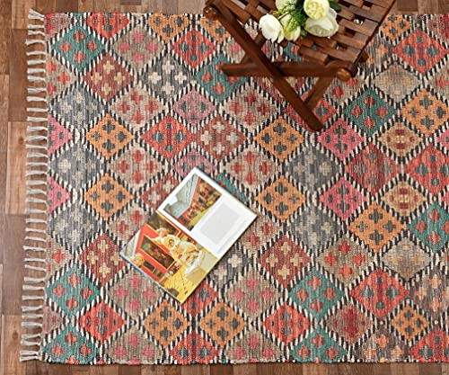 HOMA DORN Homadorn Handmade Sustainable Printed Modern Dhurrie/Rugs/Carpet Recycled Fabric for Living Room/Bedside Runner for Enhanced Decor (2 feet x 3 feet, Multicolor Geometric)