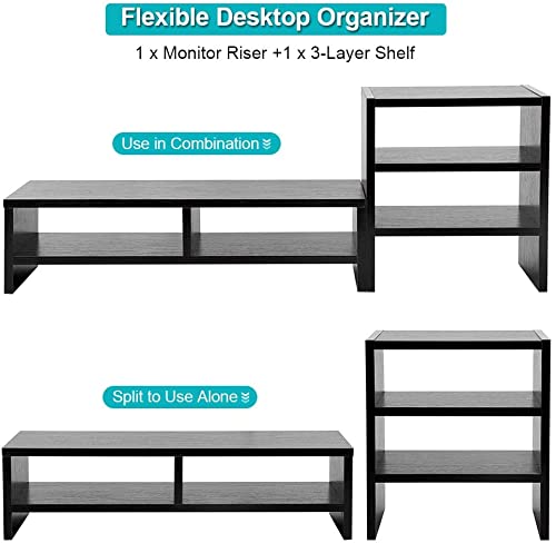 1 x Monitor Riser +1 x 3-Layer Shelf: Enough space to store, The storage space under this wooden desk shelf organizer is deep enough to hold mobile phones, pens, USB, note papers and place of job supplies, making the desktop more organized and tidy, comfortable and space-saving